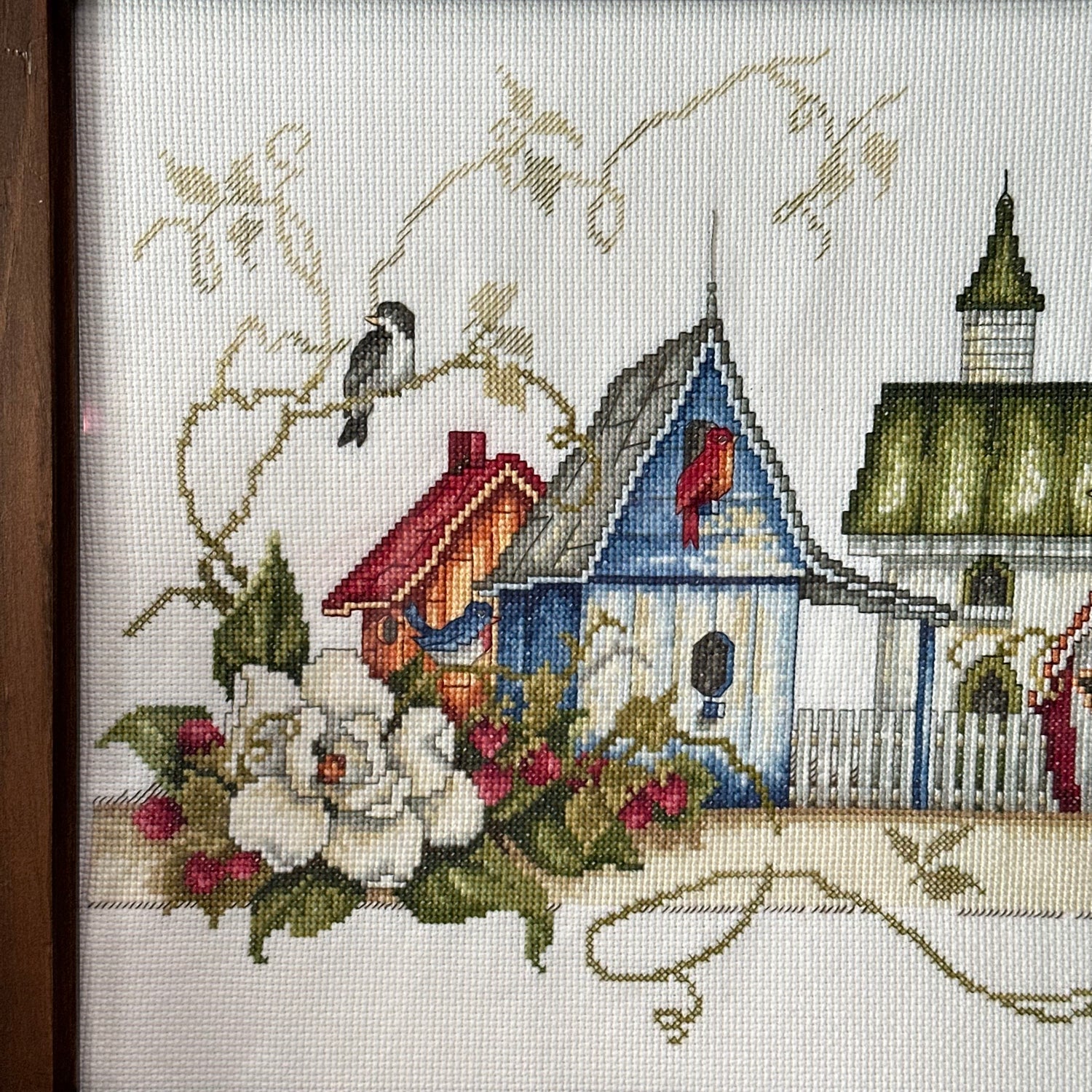 Cross Stitched Bird Houses in a Wood Frame