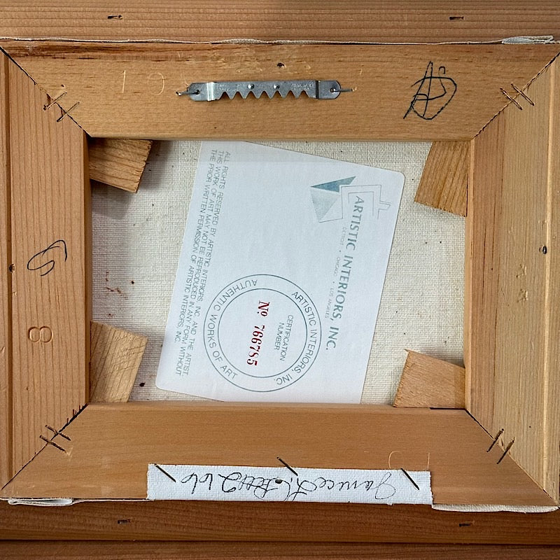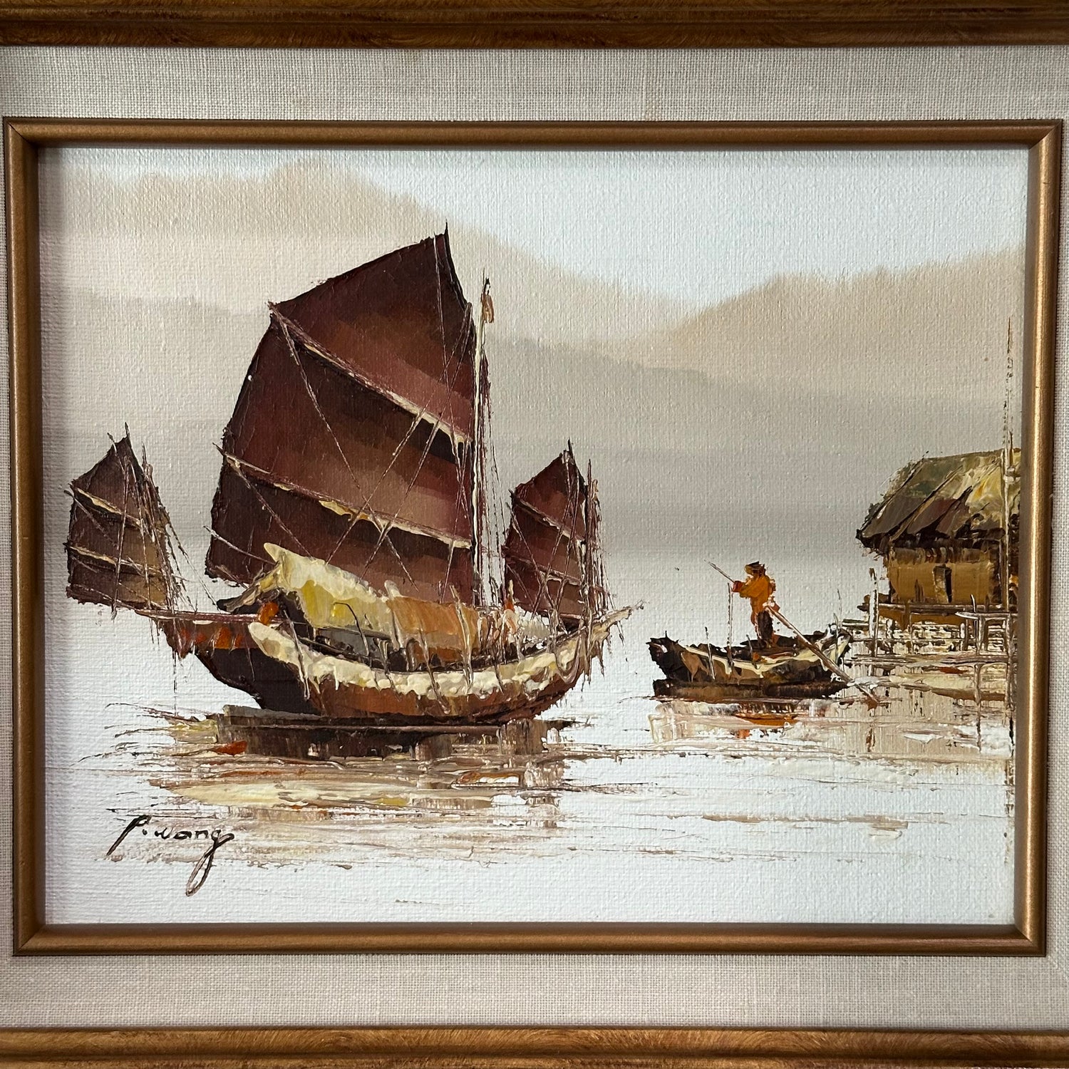 Gorgeous oil painting in a gold toned wood frame. Signed P. Wang. Has certificate of authenticity on back of painting as seen in photo.