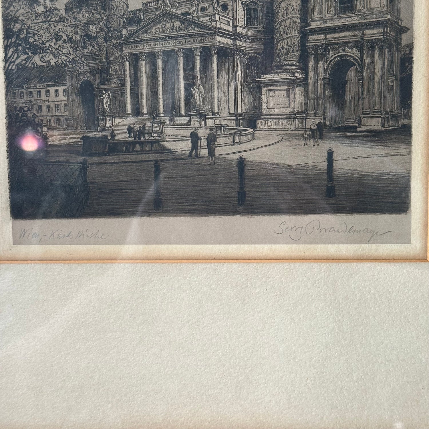 Beautifully aged etching in a wood frame. St. Charles Church (Karskirche) in Vienna, Austria. Signed. Perfect for a gallery wall or on its own.