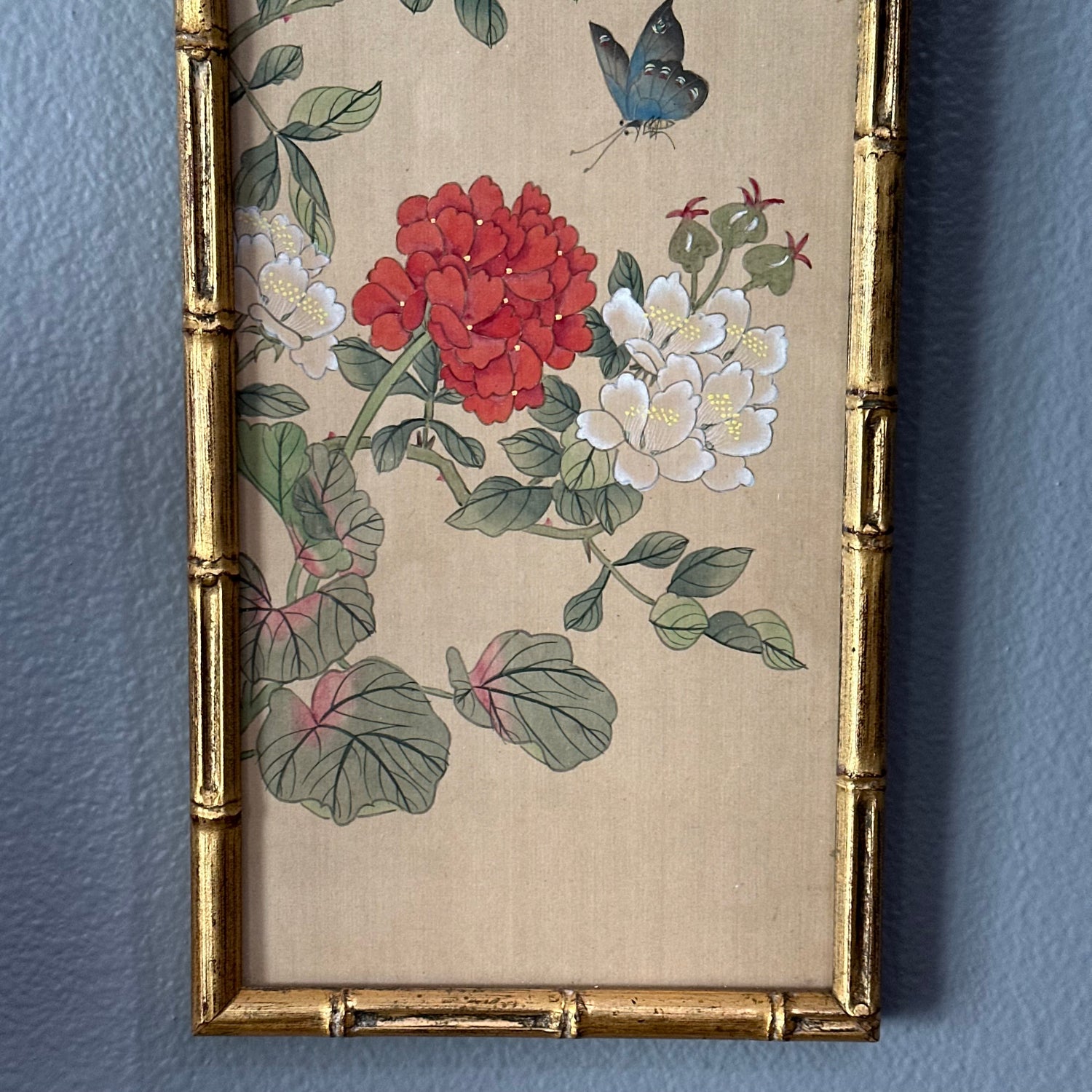 Beautiful floral art in a vintage bamboo style frame. Charm and beauty all mixed into this beautiful piece. Great addition to your gallery wall. Purchased from an estate where the son stated it had been hanging in his mother's home for at least 40 years.